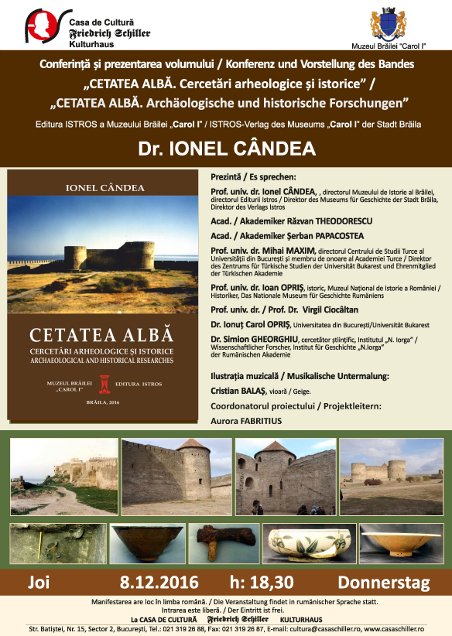 Casa de Cultură „Friedrich Schiller” în parteneriat cu Muzeul Brăilei „Carol I” și Editura „Istros" organizează joi, 8 decembrie 2016, începând cu ora 18.30, la sediul din str. Batiștei nr. 15, sector 2, București, un eveniment dedicat unei remarcabile apariții editoriale: „CETATEA ALBĂ. CERCETĂRI ARHEOLOGICE ȘI ISTORICE/ ARCHAEOLOGICAL AND HISTORICAL RESEARCHES", autor Ionel Cândea (volum bilingv română / engleză; coordonarea traducerii în limba engleză: Constantin Ardeleanu).