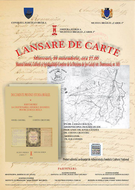 Lansare de carte "DOCUMENTE PRIVIND ISTORIA BRĂILEI. RĂSPUNSURILE LA CHESTIONARELE ODOBESCU ŞI HASDEU, PENTRU JUDEŢUL BRĂILA", editori: Ionel Cândea, Costin Croitoru (640 pagini) - apărută în cadrul unui proiect editorial co-finanţat de Administraţia Fondului Cultural Naţional, la Muzeul Istoriei, C