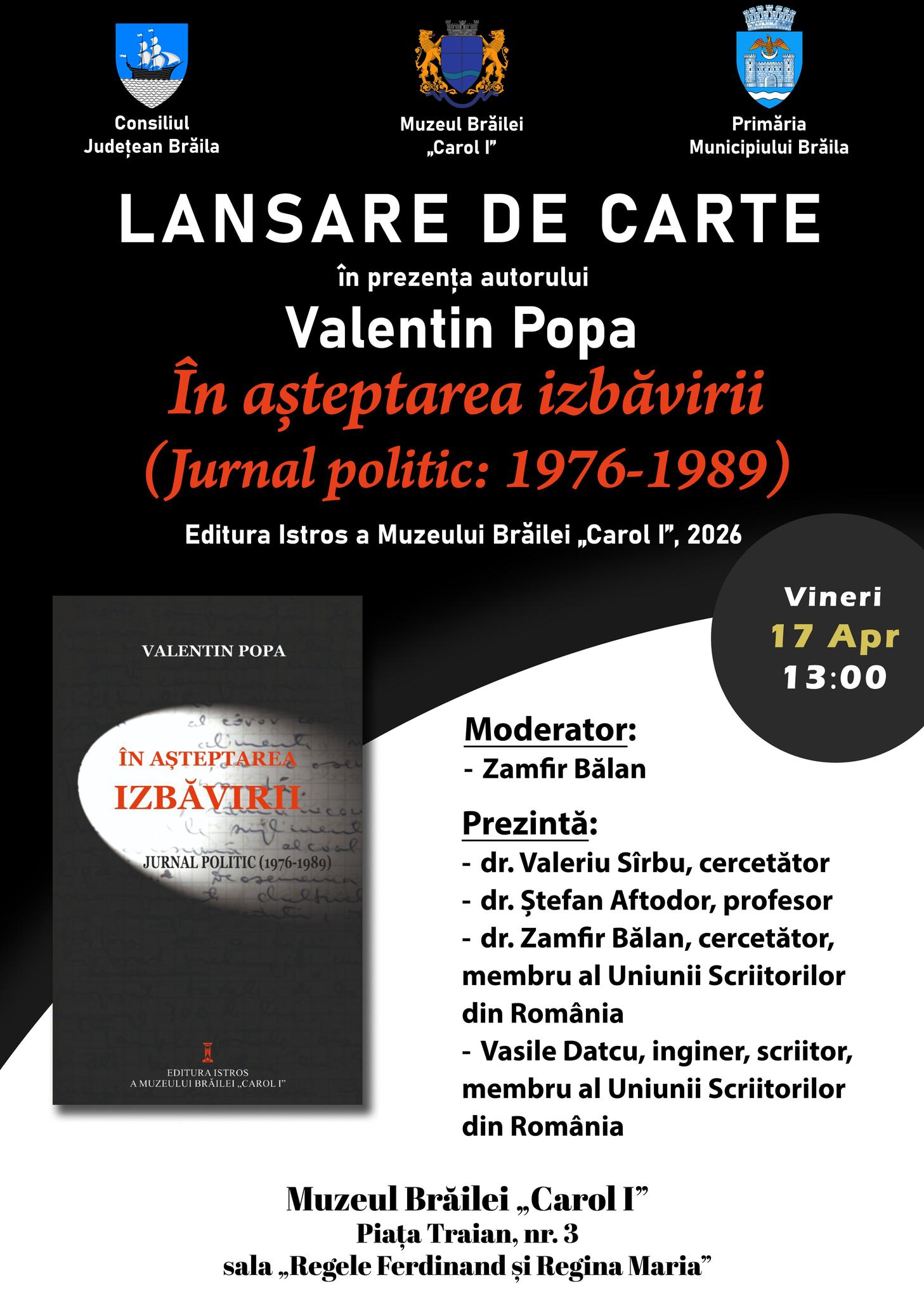 Lansarea cărții „În așteptarea izbăvirii (Jurnal politic: 1976-1989)”, autor Valentin Popa, apărută la Editura „Istros” a Muzeului Brăilei „Carol I” anul acesta - vineri, 17 aprilie, ora 13.00, la sediul Muzeului Brăilei „Carol I”, sala „Regele Ferdinand și Regina Maria” (Piața Traian, nr. 3)