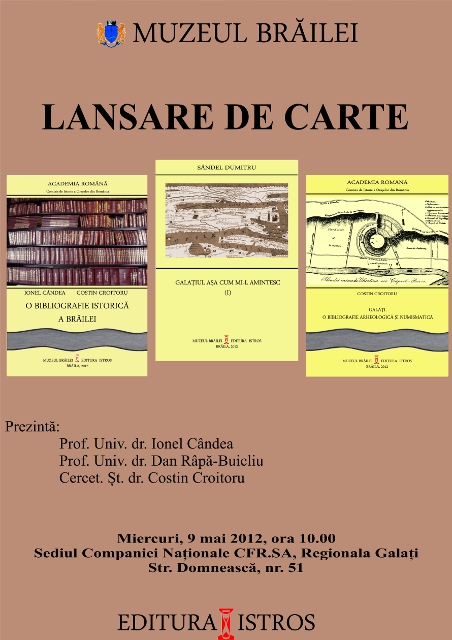 Muzeul Brăilei vă invită - miercuri, 9 mai 2012, ora 10.00, la sediul Companiei Naţionale CFR.SA, Regionala Galaţi (str. Domnească nr. 51) - la lansarea ultimelor apariţii editoriale la Editura "Istros" a Muzeului Brăilei: