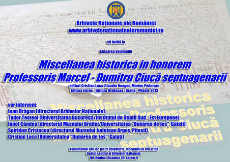 Joi, 21 noiembrie 2013, ora 12.00, la Sediul central al Arhivelor Naţionale din Bucureşti, a fost lansată cartea “Miscellanea historica in honorem Professoris Marcel–Dumitru Ciucă septuagenarii”, ediderunt Cristian Luca, Claudiu Neagoe, Marius Păduraru, Editura Istros–Editura Ordessos, Brăila–Piteşti, 2013.