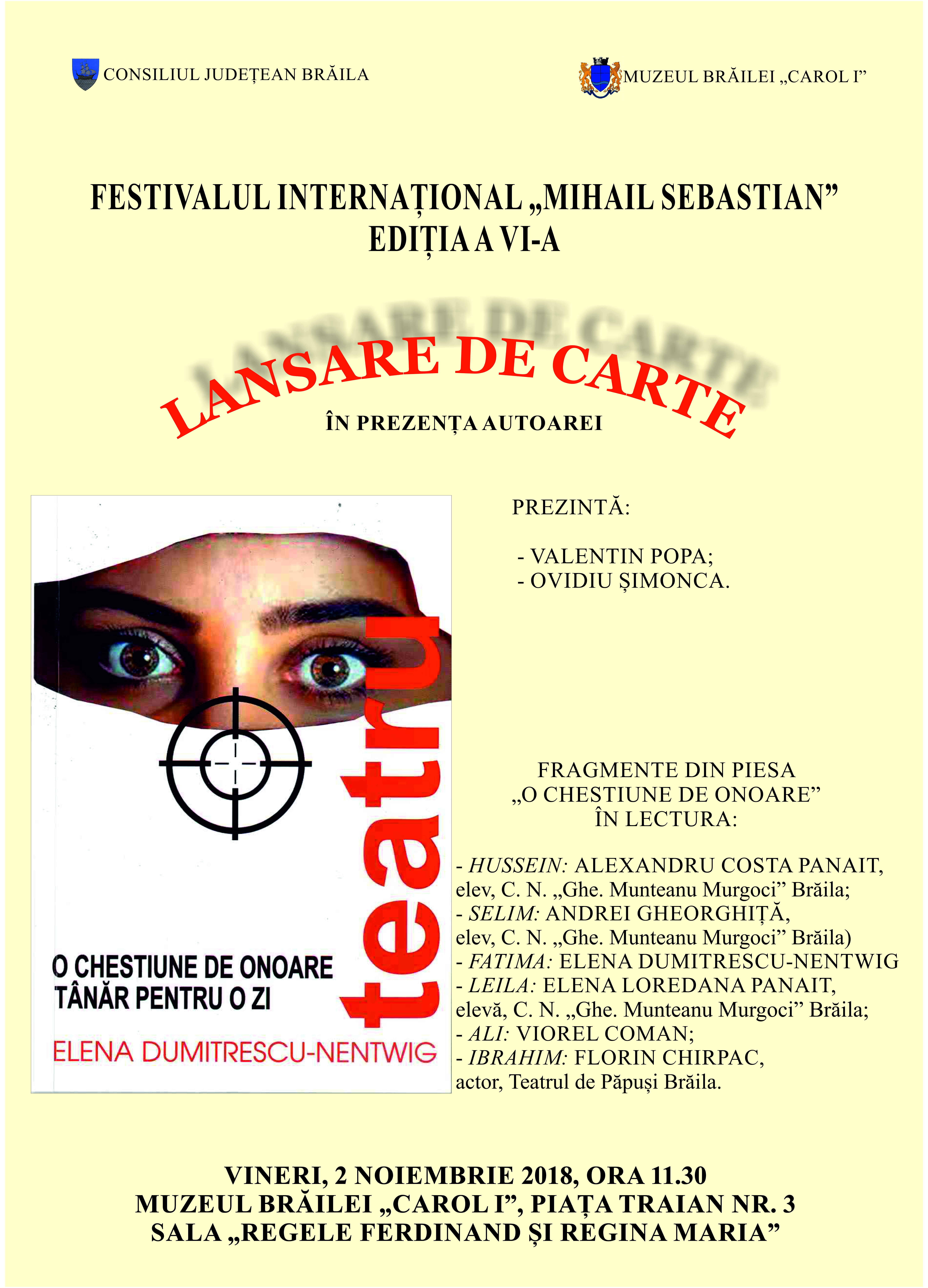 Lansare de carte „O CHESTIUNE DE ONOARE. TÂNĂR PENTRU O ZI", de Elena Dumitrescu-Nentwig, în prezenţa autoarei, la sediul Muzeului Brăilei „Carol I", sala „Regele Ferdinand şi Regina Maria" - în cadrul Festivalului Internaţional „MIHAIL SEBASTIAN", ediţia a VI-a