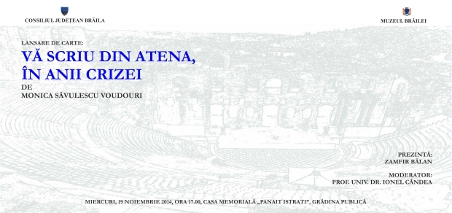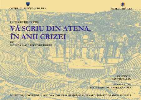 Muzeul Brăilei vă invită miercuri, 19 noiembrie 2014, ora 17.00, la Casa Memorială „Panait Istrati” din Grădina Publică, la o întâlnire cu Monica Săvulescu Voudouri, autoarea cărţii "Vă scriu din Atena în anii crizei". Prezintă: conf. univ. dr. Zamfir Bălan, cercetător - director adjunct al Muzeului Brăilei. Moderator: prof. univ. dr. Ionel Cândea, cercetător - managerul Muzeului Brăilei.