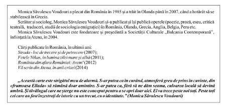 „Această carte este strigătul meu de alarmă. S-ar putea ca în curând, atmosferă greu de prins în cuvinte, din «frumoasa Elada» să rămână doar o amintire. S-ar putea ca, fără să ne dăm seama, culoarea locală să devină umbră. Şi tăvălugul care ne şterge nu este conceput pentru a se opri doar aici. El va trece peste noi toţi. Peste toţi cei care au fost înzestraţi de istorie cu un trecut , cu o identitate”. (Monica Săvulescu Voudouri).