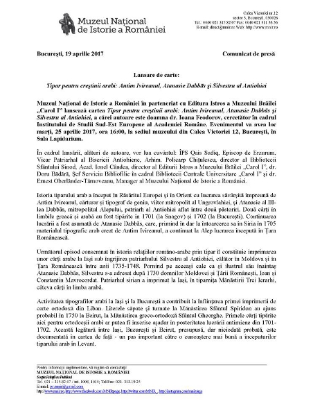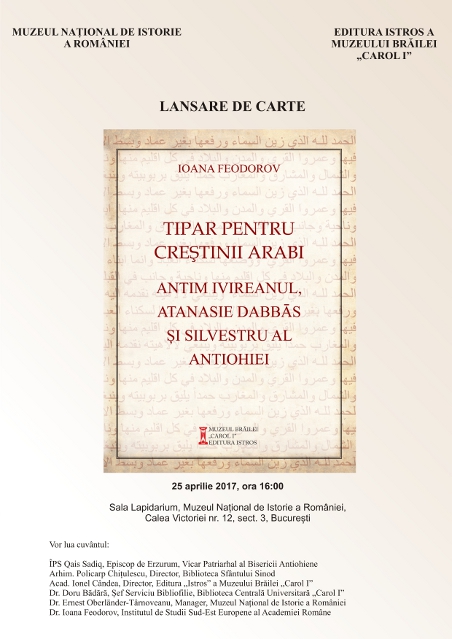Muzeul Național de Istorie a României în parteneriat cu Editura Istros a Muzeului Brăilei „Carol I” lansează cartea „Tipar pentru creştinii arabi: Antim Ivireanul, Atanasie Dabbās şi Silvestru al Antiohiei”, a cărei autoare este doamna dr. Ioana Feodorov, cercetător în cadrul Institutului de Studii Sud-Est Europene al Academiei Române. Evenimentul va avea loc marți, 25 aprilie 2017, ora 16:00, la sediul muzeului din Calea Victoriei 12, București, în Sala Lapidarium.