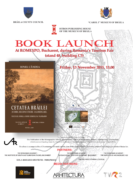 Muzeul Brăilei „Carol I” vă invită la lansarea albumului Ionel Cândea, „Cetatea Brăilei. Istoric. Reconstituire. Valorificare" (bilingv română / engleză), ce va avea loc vineri, 13 noiembrie 2015, ora 13.00, la ROMEXPO Bucureşti, în cadrul Târgului de Turism al României (Pavilion C3, Stand 48).