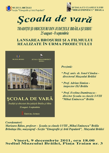 Muzeul Brăilei şi Şcoala cu clasele I-VIII „Mihai Eminescu” Brăila vă invită la lansarea broşurii şi a filmului realizate - în cadrul proiectului Şcoala de vară „Tradiţii şi obiceiuri din judeţele Brăila şi Sibiu”, derulat în perioada 25 august - 8 septembrie 2011 - cu elevii clasei a VIII-a A de la Şcoala cu clasele I-VIII „Mihai Eminescu” Brăila. Lansarea va avea loc la sediul Muzeului Brăilei din Piaţa Traian nr. 3, vineri, 9 decembrie 2011, ora 18.00.
