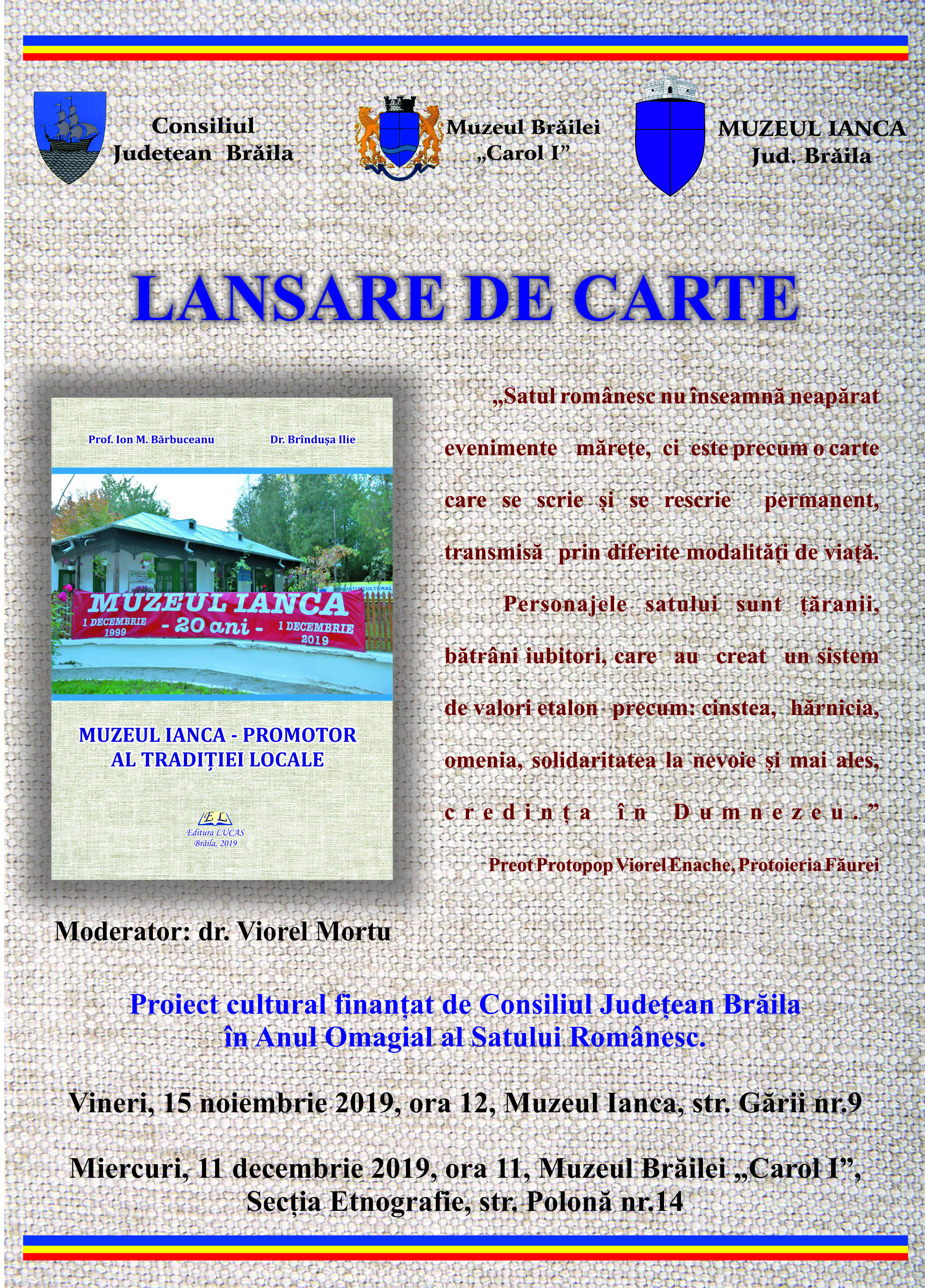 Lansarea broşurii „MUZEUL IANCA – PROMOTOR AL TRADIŢIEI LOCALE”, autori: prof. Ion Bărbuceanu și dr. Brândușa Ilie, apărută la Editura Lucas, în cadrul unui proiect finanţat de Consiliul Județean Brăila, la Secția „Etnografie” a Muzeului Brăilei „Carol I”. Proiectul a fost realizat cu ocazia Anului Omagial al Satului Românesc
