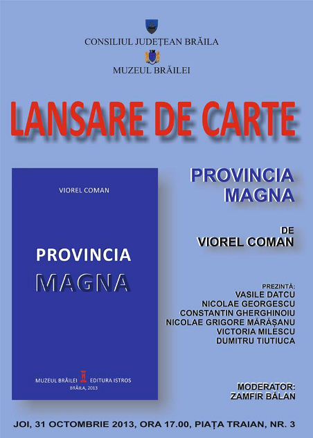 Muzeul Brăilei vă invită joi, 31 octombrie 2013, ora 17.00, la un dialog pe teme literare, prilejuit de lansarea cărții "Provincia magna" de Viorel Coman.