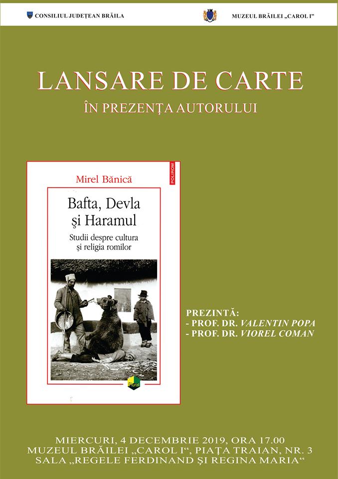 Muzeul Brăilei „Carol I” a organizat miercuri, 4 decembrie 2019, ora 17.00, în sala „Regele Ferdinand și Regina Maria” de la sediul din Piața Traian, nr. 3, lansarea cărții „Bafta, Devla și Haramul / Studii despre cultura și religia romilor", în prezența autorului Mirel Bănică.