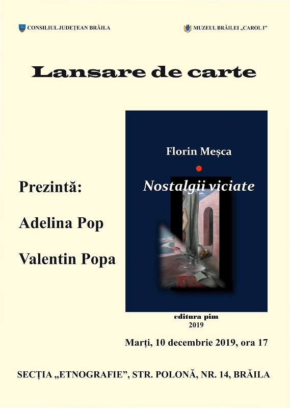 Muzeul Brăilei „Carol I”- Secția Etnografie vă invită marți, 10 decembrie 2019, ora 17, la sediul din strada Polonă, nr. 14, la lansarea cărții „Nostalgii viciate", de Florin Meșca, apărută la Editura Pim din Iași anul acesta.