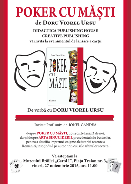 Muzeul Brăilei „Carol I” vă invită vineri, 27 noiembrie 2015, ora 11.00, la sediul din Piața Traian nr. 3, la lansarea cărții "Poker cu măști" de Doru Viorel Ursu, apărută la Editura "Creative Publishing".
