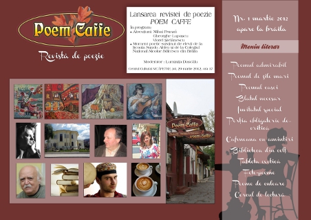 Vă invităm joi, 29 martie 2012, ora 17, la Centrul Cultural Nicăpetre pentru a participa la lansarea revistei de poezie Poem Caffé, redactor fondator Luminiţa Dascălu.