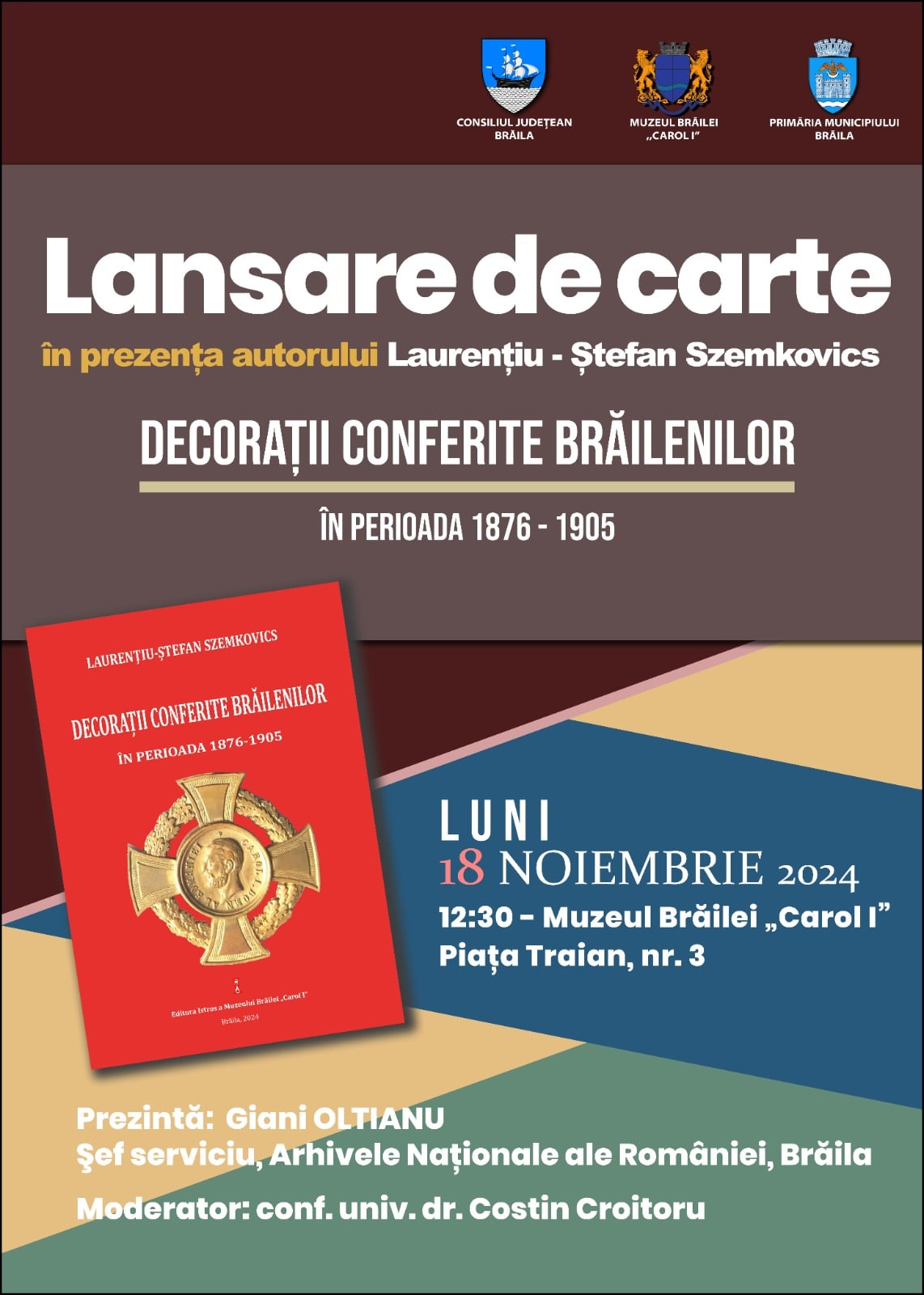 Lansarea volumului „Decorații conferite brăilenilor în perioada 1876 – 1905”, în prezența autorului, dr. Laurențiu-Ștefan SZEMKOVICS - luni, 18 noiembrie 2024, ora 12:30, la sediul Muzeul Brăilei „Carol I”, sala „Regele Ferdinand și Regina Maria” (Piața Traian nr. 3).