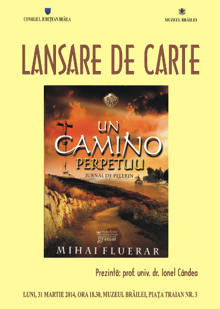 Luni, 31 martie 2014, ora 18.30, la sediul Muzeului Brăilei din Piaţa Traian nr. 3, va avea loc lansarea volumului "Un Camino perpetuu / Jurnal de pelerin", autor Aurelian Popoacă - Mihai Fluerar, apărut la editura "Mondoro", cu sprijinul editurii "Gramar".