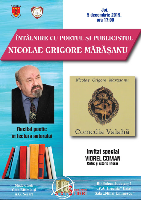 Lansări de carte - trei volume din „COMEDIA VALAHĂ”, de Nicolae Grigore Mărășanu - Vol. 1: „Iubiri și Martiraje"; Vol. 2: „Baladele din Țara Crucii"; Vol. 3: „Eudaimonia, memoria pierdută", apărute la Editura „Istros" a Muzeului Brăilei „Carol I”, în cadrul Salonului Literar „Axis Libri”, la Biblioteca Judeţeană „V.A. Urechia”