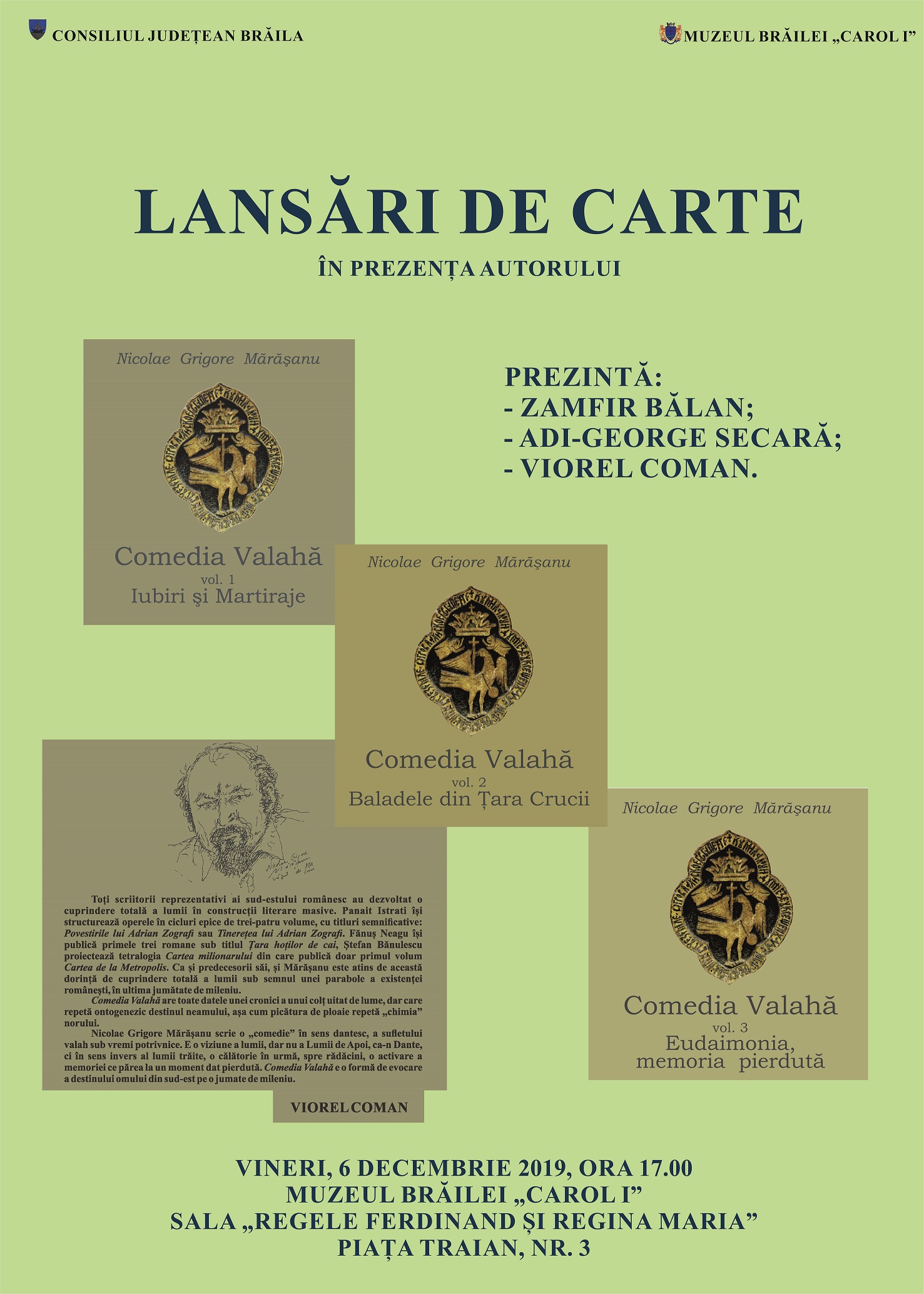 Muzeul Brăilei „Carol I” a organizat vineri, 6 decembrie 2019, ora 17.00, în sala „Regele Ferdinand și Regina Maria” de la sediul din Piața Traian, nr. 3, o triplă lansare de carte, în prezența autorului Nicolae Grigore Mărășanu, „Comedia Valahă”: