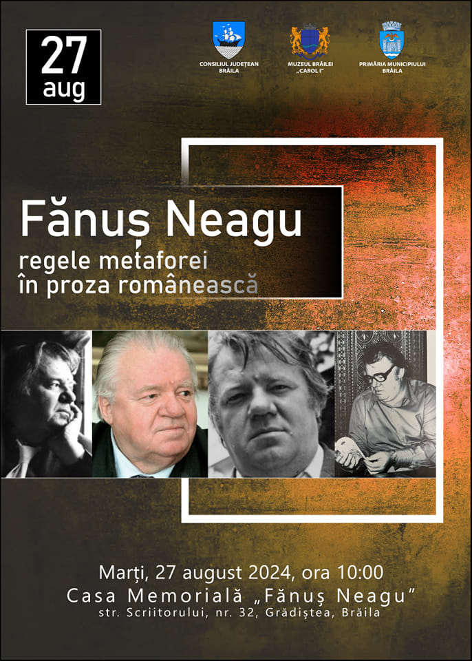 Marți, 27 august, ora 10:00, la Casa Memorială „Fănuș Neagu” din localitatea Grădiștea (jud. Brăila), strada Scriitorului, nr. 32 - manifestare cultural-artistică „Fănuș Neagu, regele metaforei în proza românească”.
