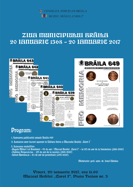 Vineri, 20 ianuarie 2017, ora 11.00, la sediul Muzeului Brăilei „Carol I” (Piața Traian, nr. 3), va avea loc manifestarea dedicată Zilei Municipiului Brăila, prilejuită de împlinirea a 649 de ani de atestare documentară (20 ianuarie 1368 - 20 ianuarie 2016).