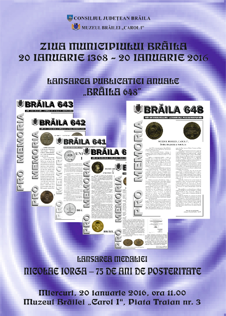 Miercuri, 20 ianuarie 2016, ora 11, la sediul Muzeului Brăilei „Carol I” ( Piața Traian, nr. 3), va avea loc manifestarea dedicată "Zilei Municipiului Brăila", prilejuită de împlinirea a 648 de ani de atestare documentară (20 ianuarie 1368 - 20 ianuarie 2016).