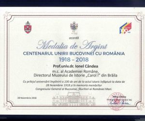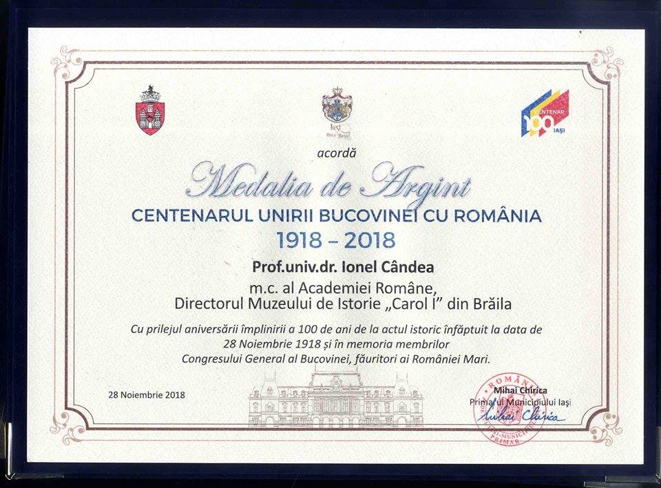 MEDALIA DE ARGINT „CENTENARUL UNIRII BUCOVINEI CU ROMÂNIA", decernată prof. univ. dr. Ionel Cândea, membru corespondent al Academiei Române, managerul Muzeului „Carol I” din Brăila, de Primarul Municipiului Iași – pentru contribuția esențială la editarea colecțiilor „Basarabica” și „Civilizație românească” ale Academiei Române, apărute la Editura „Istros” a Muzeului Brăilei „Carol I” – cu ocazia aniversării Centenarului Unirii Bucovinei cu România (28 noiembrie 1918 - 28 noiembrie 2018) în cadrul Ședinței Solemne a Consiliului Local al Municipiului Iași, la Palatul Roznovanu din Iaşi.