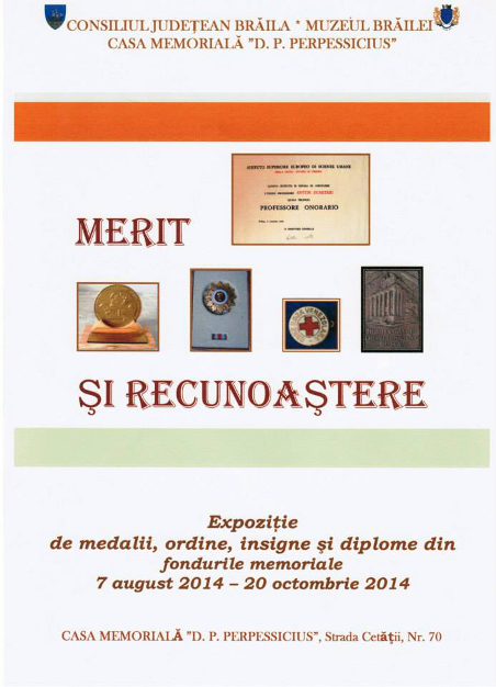 Expoziţia de medalii, ordine, insigne şi diplome din colecţiile Secţiei Memoriale a Muzeului Brăilei "Merit şi recunoaştere" este deschisă în perioada 7 august - 20 octombrie 2014, la Muzeul Brăilei - Casa Memorială "Dumitru Panaitescu Perpessicius" (str. Cetăţii nr. 70)