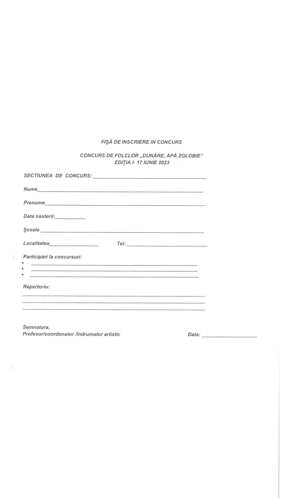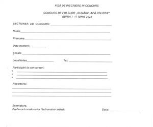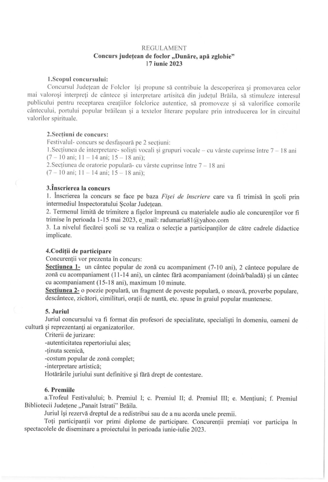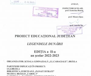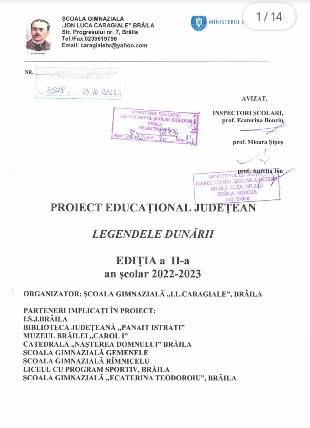 Vă așteptăm la Concursul Județean de folclor „Dunăre, apă zglobie" din cadrul Proiectului Județean „Legendele Dunării" inițiat de Școala Gimnazială „Ion Luca Caragiale", în parteneriat cu L.P.S. Brăila, Școala Gimnazială „Ecaterina Teodoroiu" Brăila, Școala Gimnazială Râmnicelu, Școala Gimnazială Gemenele din Comuna Gemenele, Biblioteca Judeteana „Panait Istrati" Braila, Muzeul Brăilei „Carol I" , Catedrala „Nașterea Domnului" Brăila, Muzeul Ianca.