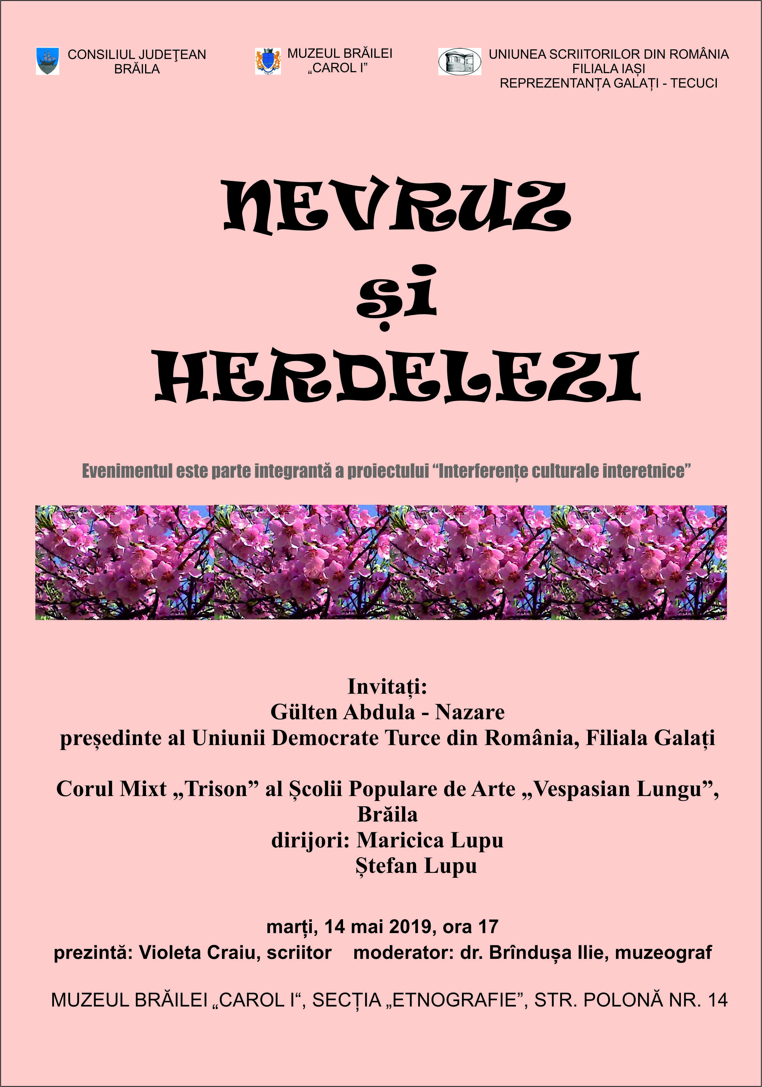 Muzeul Brăilei „Carol I” - Secţia Etnografie organizează marți, 14 mai 2019, ora 17.00, la sediul din strada Polonă, nr. 14, o nouă etapă din cadrul proiectului „Interferențe culturale interetnice”, în colaborare cu Uniunea Scriitorilor din România – Filiala Iași, Reprezentanța Galați-Tecuci, cu tema: „NEVRUZ ȘI HERDELEZI".
