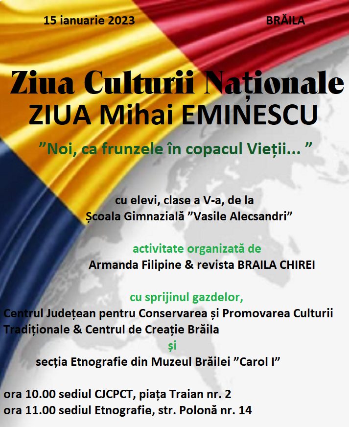 „NOI, CA FRUNZELE ÎN COPACUL VIEȚII...". Eveniment dedicat Zilei Eminescu & Zilei Culturii Naționale, la Muzeul Brăilei „Carol I” - Secția Etnografie și Artă populară