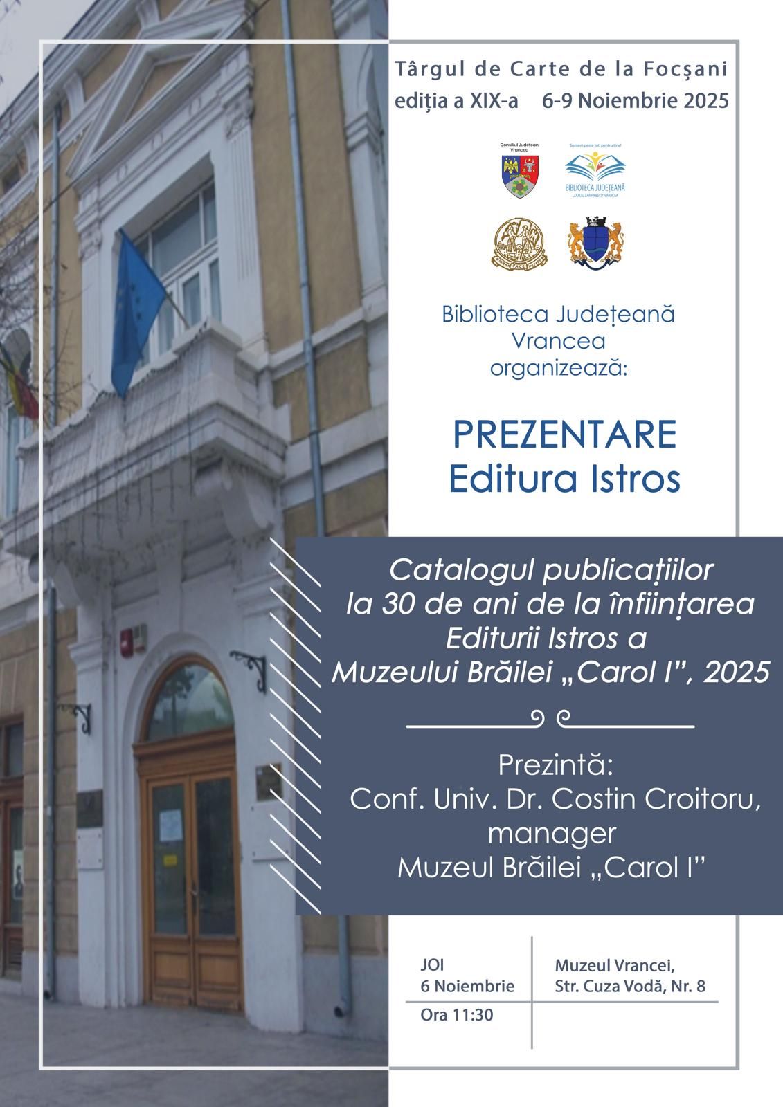 La ora 11:30 a avut loc prezentarea „Catalogului publicațiilor la 30 de ani de la înființarea Editurii Istros a Muzeului Brăilei „Carol I””, Brăila, 2025, de către managerul Muzeului Brăilei „Carol I”, conf. univ. dr. Costin Croitoru.