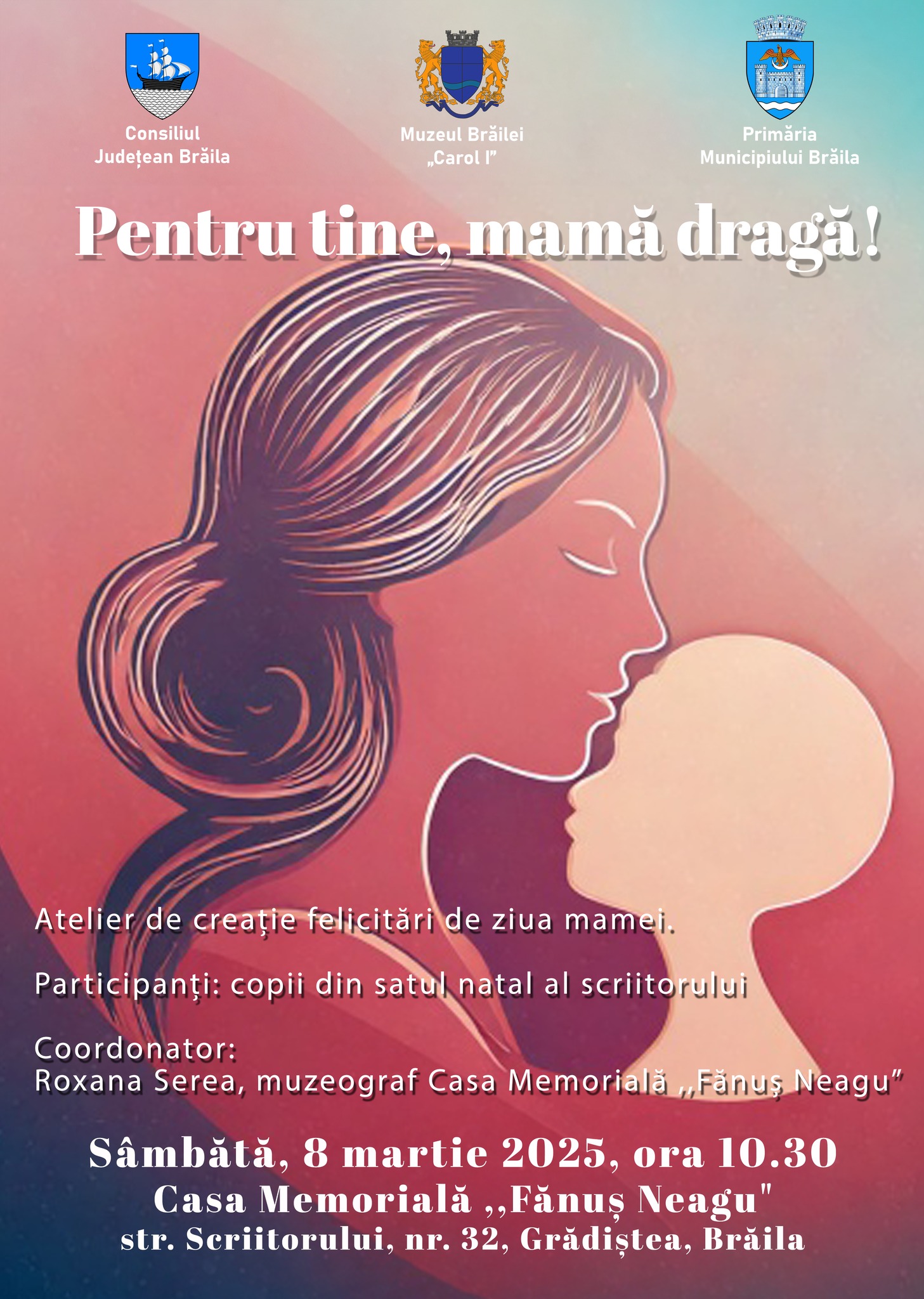 Muzeul Brăilei „Carol I” organizează sâmbătă, 8 martie 2025, ora 10:30, la Casa Memorială ,,Fănuș Neagu" din com.Grădiștea, județul Brăila (str. Scriitorului, nr. 32) ), un atelier de creație de felicitări - „Pentru tine, mamă dragă!”, cu ocazia Zilei Internaționale a Mamei.