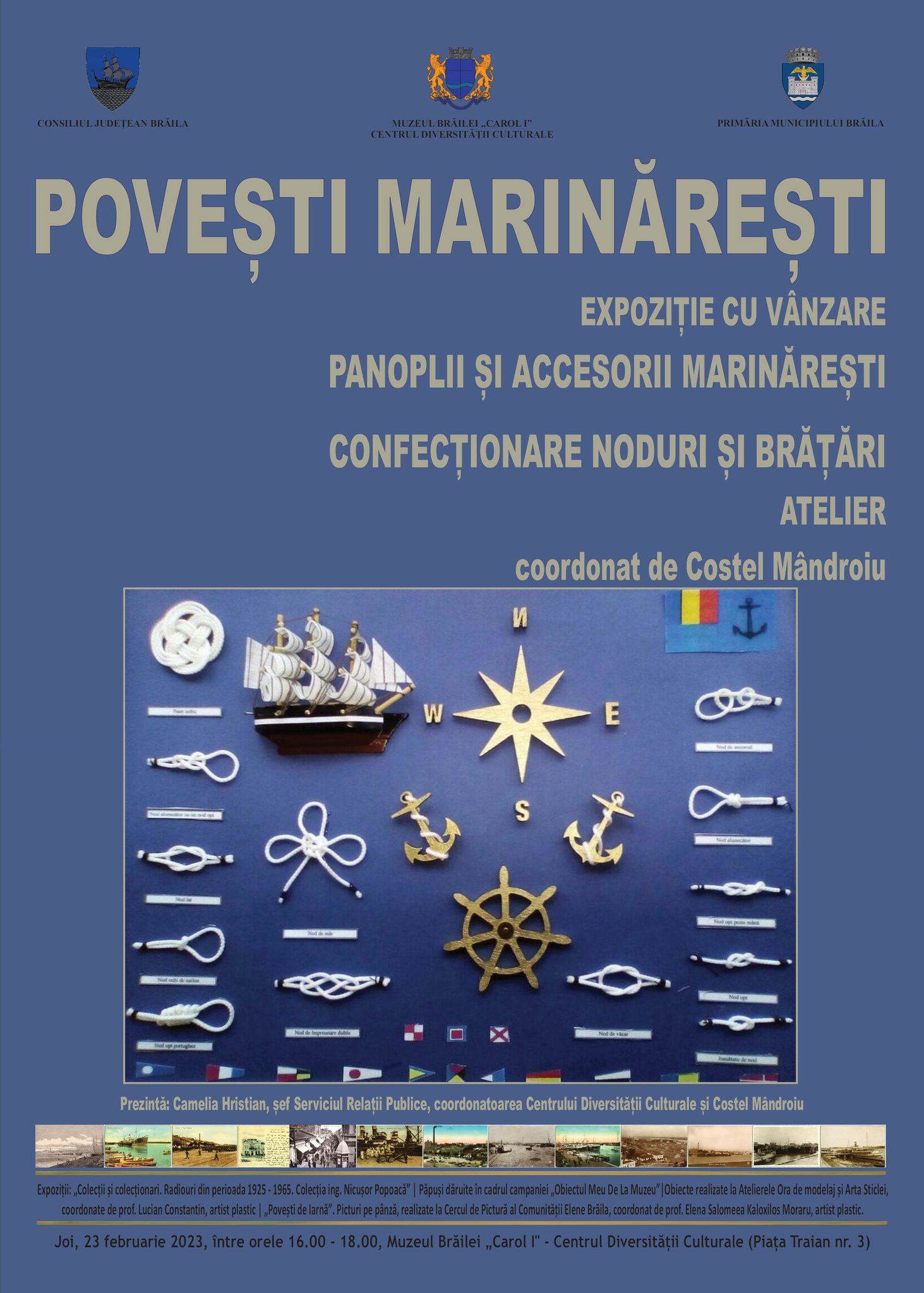 „Povești Marinărești”. Expoziție cu vânzare - Panoplii și accesorii marinărești | Confecționare noduri și brățări, Atelier coordonat de Costel Mândroiu | Prezentări - joi, 23 februarie 2023, între orele 16.00 - 18.00, la Muzeul Brăilei „Carol I” - Centrul Diversității Culturale.