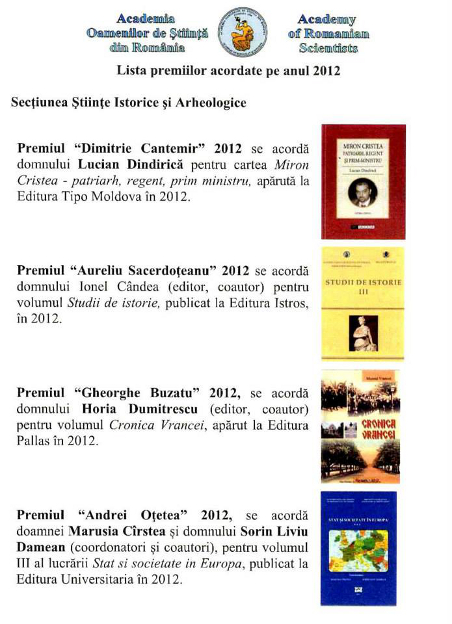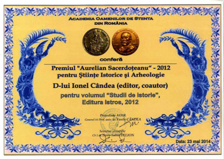 La secţiunea "Ştiinţe Istorice şi Arheologie", Premiul "Aurelian Sacerdoţeanu" a fost conferit managerului Muzeului Brăilei - prof. univ. dr. Ionel Cândea (autor, coautor) pentru volumul "Studii de Istorie", Editura "Istros" a Muzeului Brăilei, 2012.