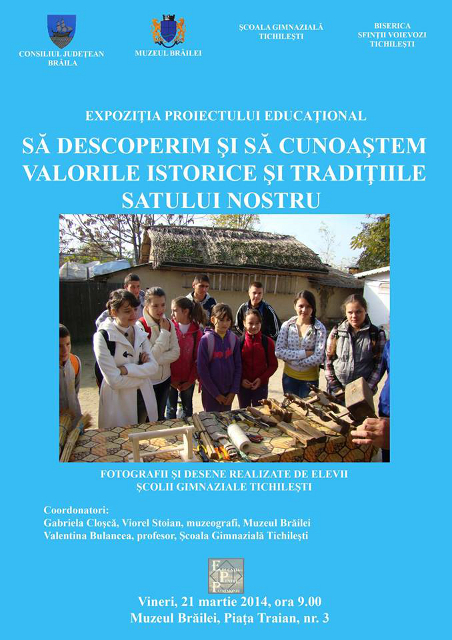 Vineri, 21 martie 2014, ora 9.00, la Centrul Memorial „Nae Ionescu, Vasile Băncilă, Anton Dumitriu, Ana Aslan, Edmond Nicolau” din Piaţa Traian nr. 3 (intrarea prin strada Galaţi), va avea loc prezentarea rezultatelor proiectului şi a expoziţiei „Să descoperim şi să cunoaştem valorile istorice şi tradiţiile satului nostru”. Proiectul a fost organizat de Muzeul Brăilei în colaborare cu Şcoala Gimnazială Tichileşti şi Biserica „Sfinţii Voievozi” Tichileşti, desfăşurându-se în perioada februarie 2013 – martie 2014.