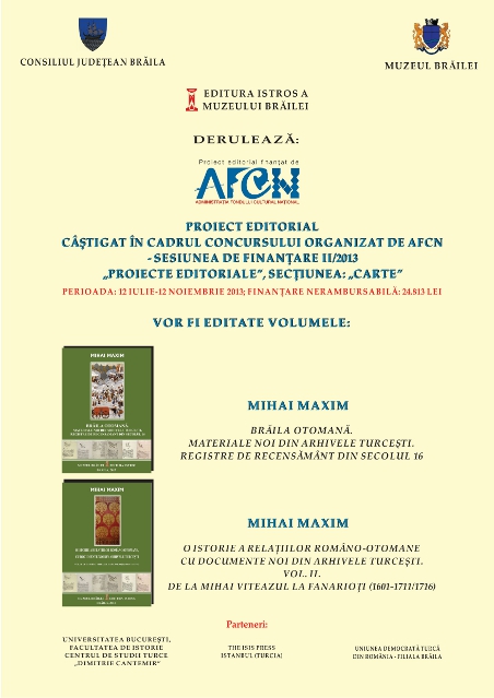 Muzeul Brăilei derulează – în perioada 12 iulie-12 noiembrie 2013 – un proiect editorial finanţat de Administraţia Fondului Cultural Naţional, câştigat în cadrul concursului organizat de AFCN – sesiunea de finanţare II/2013 „Proiecte editoriale”, secţiunea: „Carte”. Partenerii pentru promovarea proiectului sunt: Universitatea Bucureşti, Facultatea de Istorie - Centrul de Studii Turce „Dimitrie Cantemir”, The Isis Press Istanbul (Turcia) şi Uniunea Democrată Turcă din România - filiala Brăila. Suma aprobată ca finanţare nerambursabilă este: 24.813 lei, reprezentând cheltuieli necesare pentru editarea volumelor: Mihai Maxim, „Brăila otomană. Materiale noi din arhivele turceşti. Registre de recensământ din sec. XVI” (250 pagini) şi Mihai Maxim, „O istorie a relaţiilor româno-otomane cu documente noi din arhivele turceşti. Vol. II. De la Mihai Viteazul la fanarioţi (1601-1711/1716)” (550 pagini).