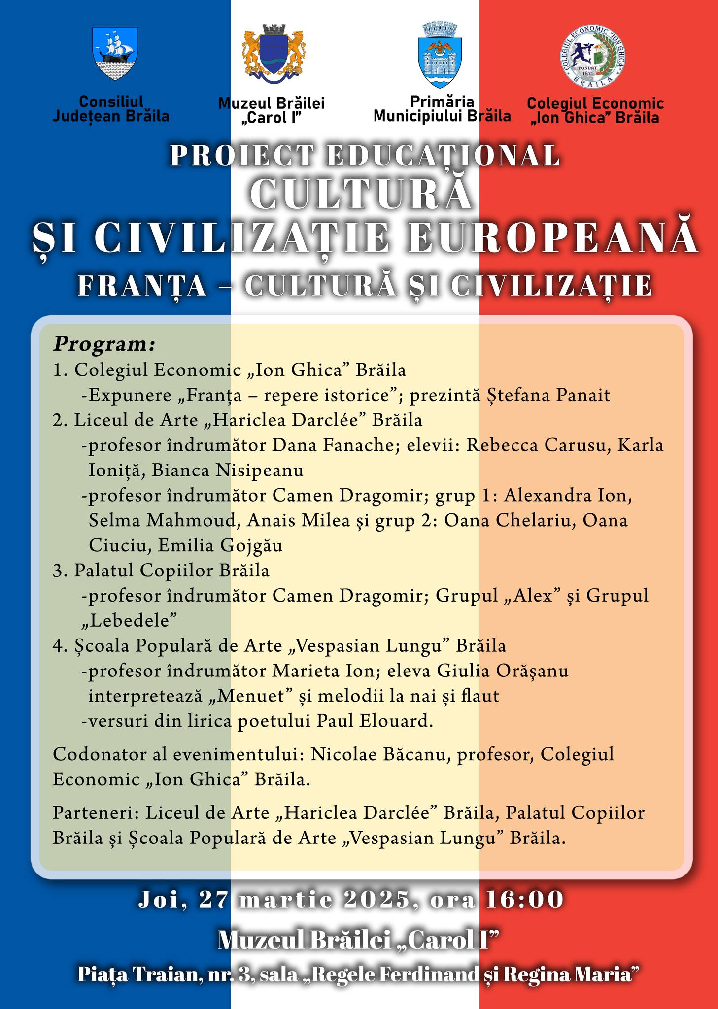 Proiectul educațional „CULTURĂ ȘI CIVILIZAȚIE EUROPEANĂ”. FRANȚA – CULTURĂ ȘI CIVILIZAȚIE, la sediul Muzeului Brăilei „Carol I”, sala „Regele Ferdinand și Regina Maria”