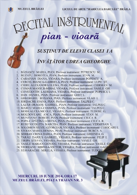 Astăzi, 18 iunie 2014, ora 17.00, în sala de festivităţi a Muzeului Brăilei din Piaţa Traian nr. 3, are loc un recital de pian şi vioară, susţinut de elevii clasei I A de la Liceul de Arte "Hariclea Darclée" Brăila, realizat sub îndrumarea domnului învăţător Udrea Gheorghe.