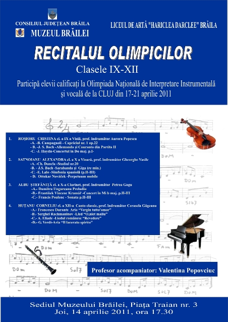 Muzeul Brăilei este gazda Recitalului olimpicilor organizat de Liceul de Artă „Hariclea Darcleé” Brăila, joi, 14 aprilie 2011, ora 17.30 la sediul din Piaţa Traian nr. 3.