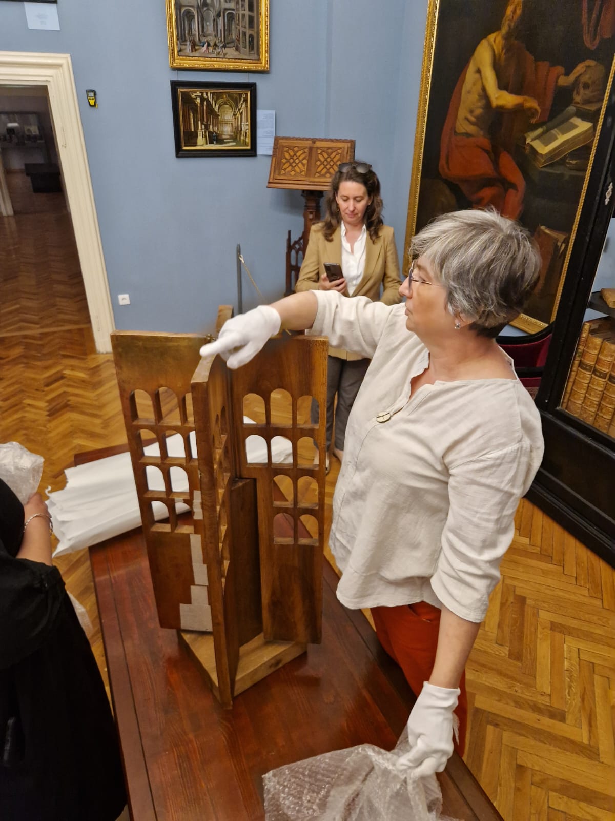 În imagini, predarea lucrărilor de la Muzeul Brăilei „Carol I”: Ștefan Maitec, fiul artistului; Irina Ungureanu, curatorul expoziției; Alexandra Maria Runcan, șef secție la Muzeul Național Brukenthal din Sibiu; Liliana Gâță, conservator - Serviciul Evidența și Protejarea Patrimoniului, Muzeul Brăilei „Carol I”.