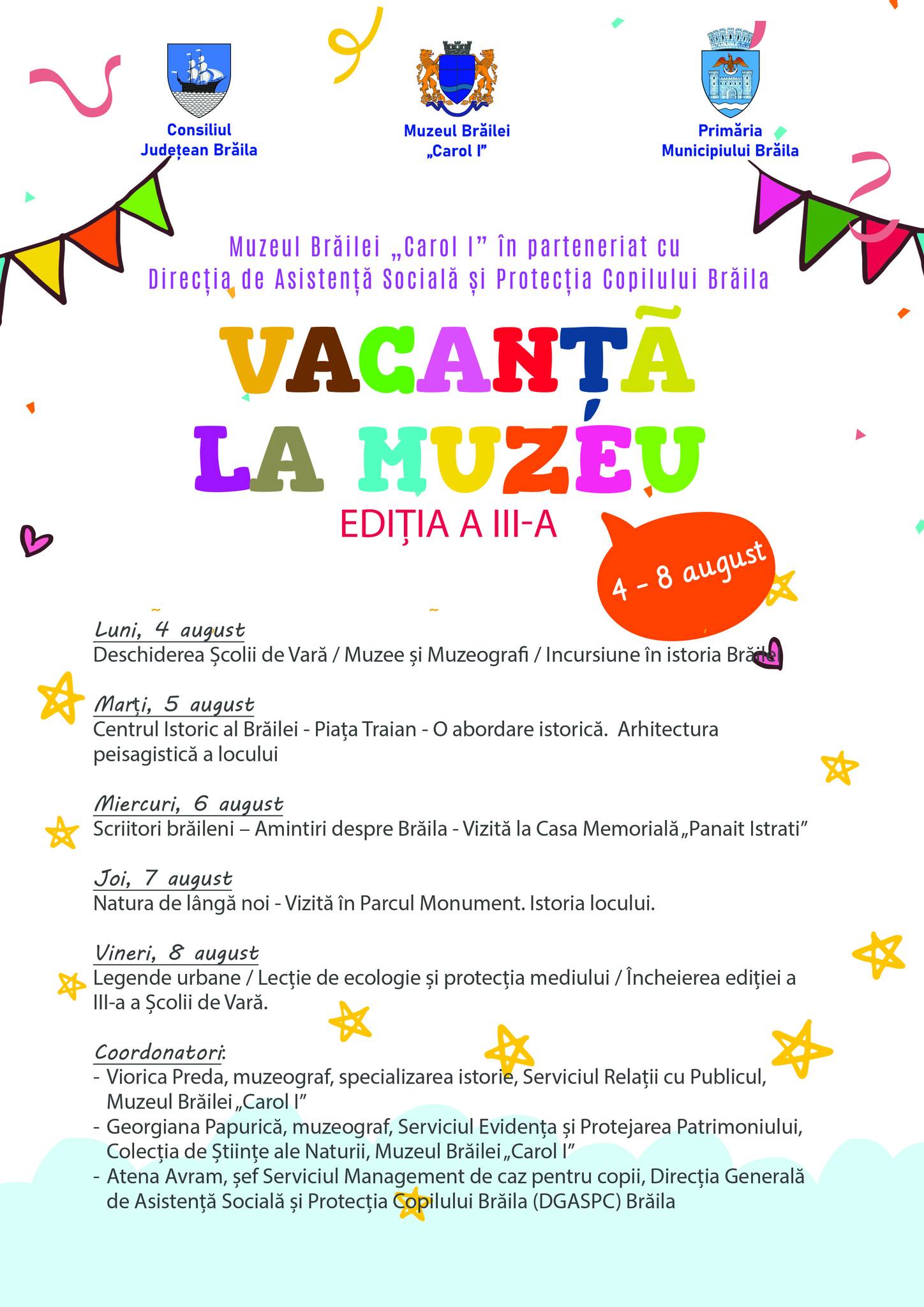 Muzeul Brăilei „Carol I” în parteneriat cu Direcția de Asistență Socială și Protecția Copilului Brăila organizează Școala de vară „Vacanță la muzeu”, ediția a III-a, în perioada 4 - 8 august 2025.