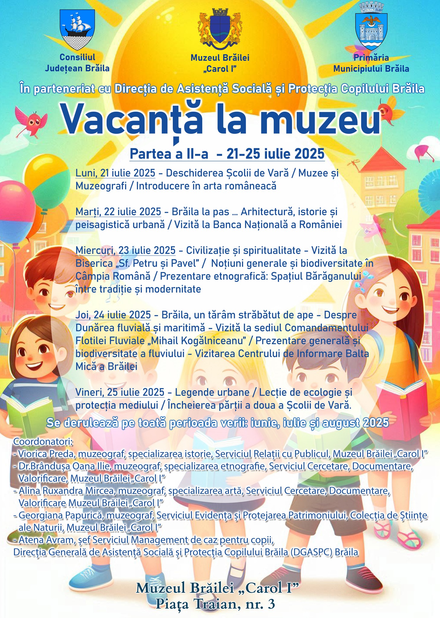 Muzeul Brăilei „Carol I”, în parteneriat cu Direcția de Asistență Socială și Protecția Copilului Brăila - „Vacanța la muzeu”, Ediția a II- a școlii de vară, 21-25 iulie 2025.