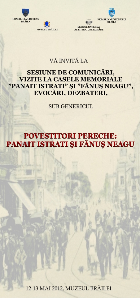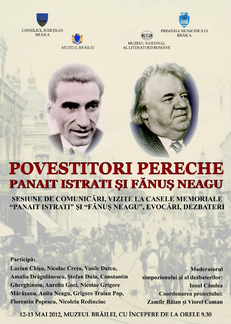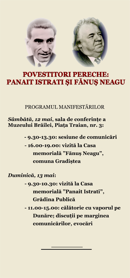 Pe 12 şi 13 mai a. c., se va desfăşura la Muzeul Brăilei prima ediţie a unei serii de manifestări dedicate scriitorilor Panait Istrati şi Fănuş Neagu.