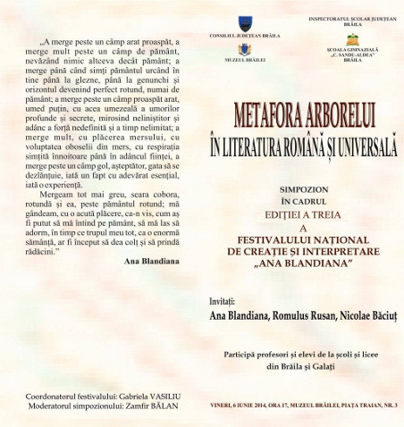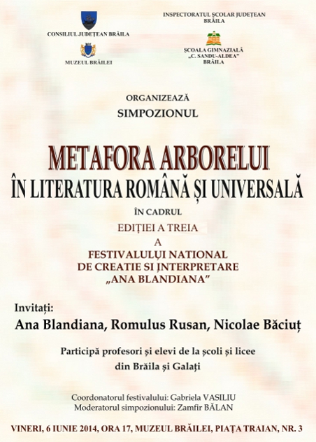 Muzeul Brăilei, în colaborare cu Şcoala Gimnazială „Constantin Sandu-Aldea” Brăila, organizează vineri, 6 iunie 2014, ora 17, în sala de festivităţi a Muzeului Brăilei din Piaţa Traian nr. 3, un simpozion cu tema „Metafora arborelui în literatura română şi universală”, în cadrul ediţiei a treia a Festivalului Naţional de Creaţie şi Interpretare „Ana Blandiana”. Invitaţi: Ana Blandiana, Romulus Rusan, Nicolae Băciuţ. Participă elevi şi profesori de la şcoli şi licee din Brăila şi Galaţi. Coordonatorul festivalului: Gabriela Vasiliu. Moderatorul simpozionului: Zamfir Bălan.