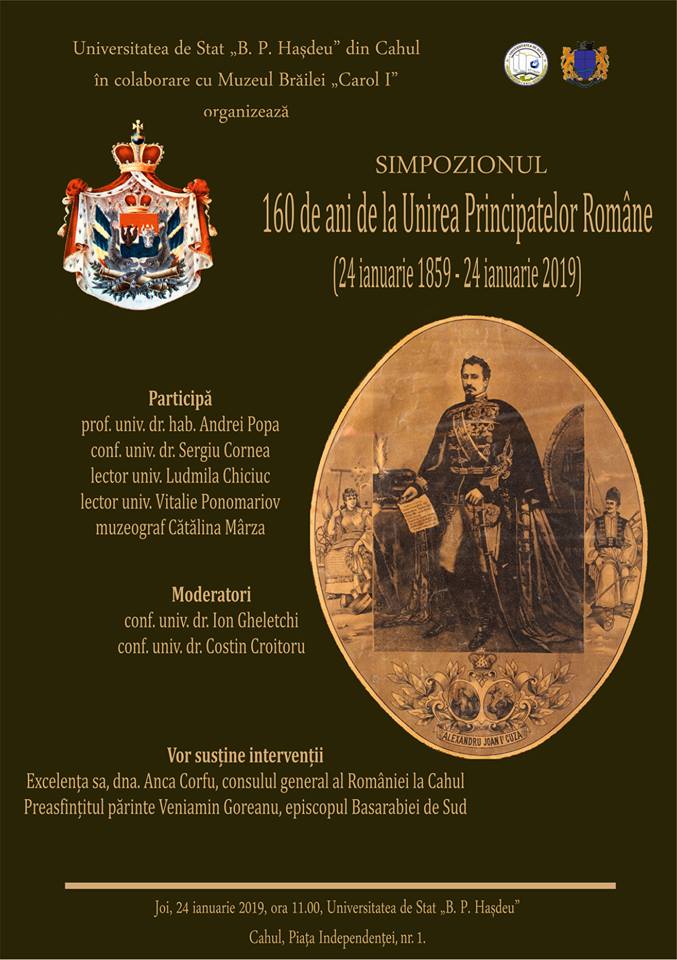 Universitatea de Stat „B. P. Hasdeu" din Cahul, în colaborare cu Muzeul Brăilei „Carol I", a organizat Simpozionul „160 de ani de la Unirea Principatelor Române (24 ianuarie 1859- 24 ianuarie 2019)”. Evenimentul a avut loc joi, 24 ianuarie, ora 11.00, la Universitatea de Stat „B. P. Hasdeu" Cahul.