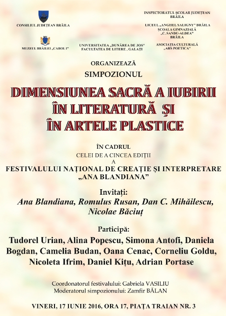 Muzeul Brăilei „Carol I”, în colaborare cu Liceul Tehnologic „Anghel Saligny” Brăila, Școala Gimnazială „Constantin Sandu Aldea” Brăila, Facultatea de Litere a Universității „Dunărea de Jos” Galați și Asociația Culturală „Ars Poetica” organizează vineri, 17 iunie 2016, ora 17, la sediul Muzeului Brăilei „Carol I” (Piața Traian nr. 3), simpozionul „Dimensiunea sacră a iubirii în literatură și în artele plastice”, în cadrul celei de a cincea ediții a Festivalului Național de Creație și Interpretare „Ana Blandiana”.