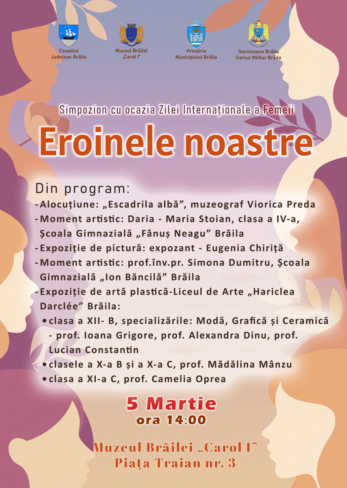 Joi, 5 martie, începând cu ora 14:00, Muzeul Brăilei „Carol I” împreună cu Garnizoana Brăila și Cercul Militar Brăila organizează cu ocazia Zilei Internaționale a Femeii simpozionul „Eroinele noastre”, în sala „Regele Ferdinand și Regina Maria”, la sediul muzeului din Piața traian, nr. 3.