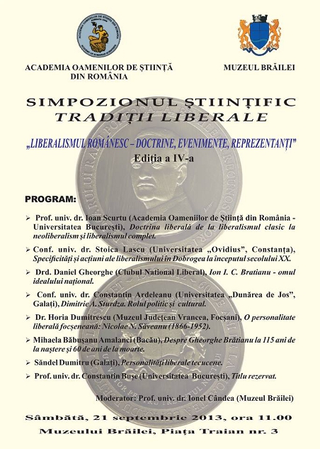 Program: prof. univ. dr. Ioan Scurtu (Academia Oamenilor de Știință din România – Universitatea București), “Doctrina liberală de la liberalismul clasic la neoliberalism și liberalismul complet”; conf. univ. dr. Stoica Lascu (Universitatea “Ovidius” Constanța ), “Specificități și acțiuni ale liberalismului în Dobrogea la începutul secolului XX”, drd. Daniel Gheorghe (Clubul Național Liberal),”Ion I. C. Brătianu - omul idealului național”, conf. univ. dr. Constantin Ardeleanu (Universitatea “Dunărea de Jos” Galați), “Dimitrie A. Sturdza. Rolul politic și cultural”, dr. Horia Dumitrescu (Muzeul Județean Vrancea, Focșani), ”O personalitate liberal focșăneană: Nicolae N. Săveanu (1866-1952)”, Mihaela Băbușanu Amalanci (Bacău), “Despre Gheorghe Brătianu la 115 ani de la naștere și 60 de ani de la moarte”, Săndel Dumitru (Galați), “Personalități liberale tecucene”, prof. univ. dr. Constantin Bușe (Universitatea București), Titlu rezervat. Moderator: prof. univ. dr. Ionel Cândea, managerul Muzeului Brăilei.
