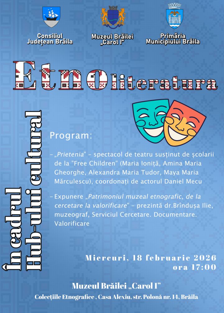 Muzeul Brăilei „Carol I” - Casa Colecțiilor Etnografice, organizează miercuri, 18 februarie, începând cu ora 17:00, o nouă întâlnire în cadrul Hub-ului cultural „Etnoliteratura”, la Casa Alexiu (str. Polonă, nr.14).