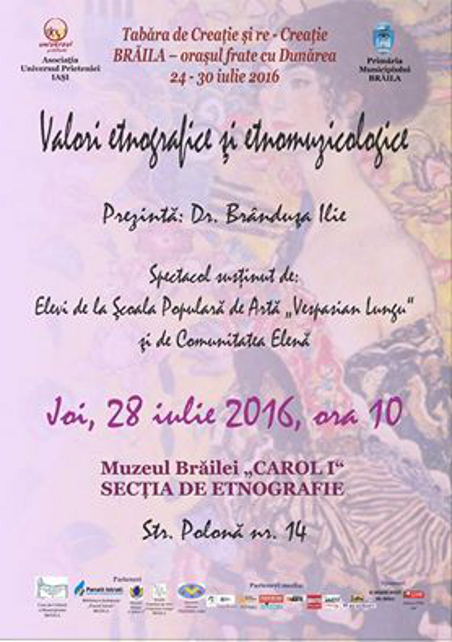 Ziua dedicată valorilor etnografice şi etnomuzicologice este cea de joi, 28 iulie 2016, ora 10, când vom vizita Muzeul Etnografic şi vom participa la un mic spectacol oferit de elevi de la Şcoala Populară de Artă “Vespasian Lungu” şi de comunitatea elenă.