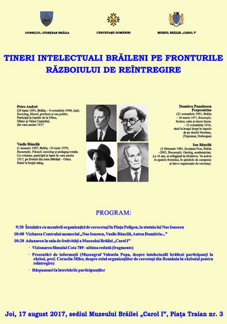 „TINERI INTELECTUALI BRĂILENI PE FRONTURILE RĂZBOIULUI DE REÎNTREGIRE”, la statuia lui Nae Ionescu din Piața Poligon, Muzeul Brăilei „Carol I" - Centrul Memorial „Nae Ionescu, Vasile Băncilă, Anton Dumitriu, Ana Aslan, Valeriu Dinu" și sediul Muzeului Brăilei „Carol I"